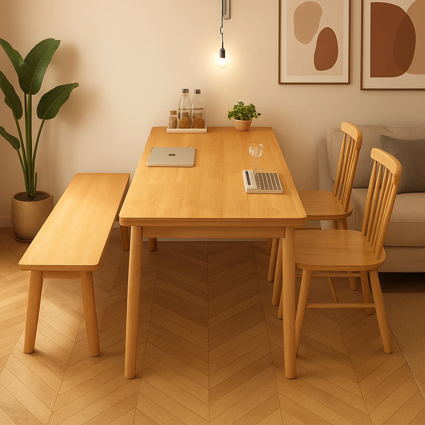 北欧スタイルのナチュラルウッドダイニングテーブル|シンプルでおしゃれな長方形テーブルセット|小さなリビングにもぴったりな和風デザインの食卓家具