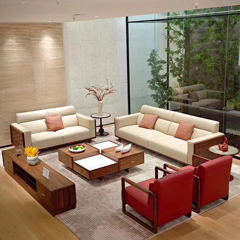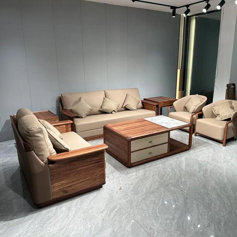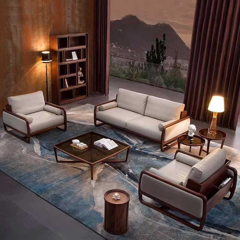 2025 New Style Leather Sofa - Solid Wood Sofa for Living Room, New Chinese Design for Office Lounge, Walnut Wood Villa Home Furniture