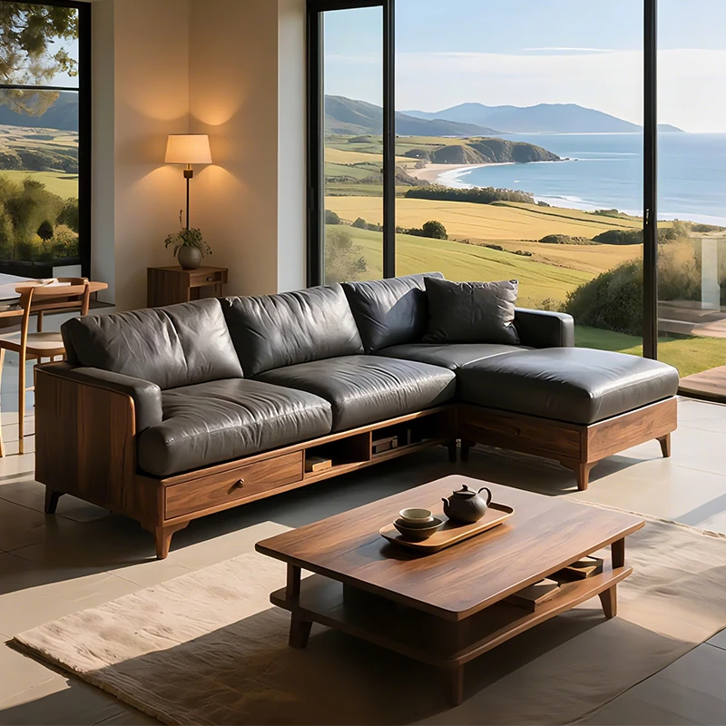 2025 New Style Minimalist L-Shaped Solid Wood Sofa - Walnut Leather Upholstered Storage Sofa for Modern Home Living Room