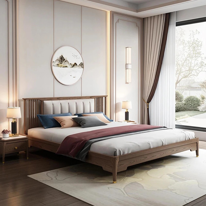 Elegant New Chinese Style King Size Bed - 2025 New Luxury Leather Upholstered Double Bed with Walnut Wood Frame for a Chic and Sophisticated Master Bedroom.
