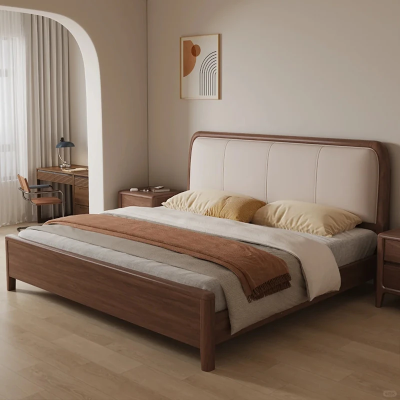 Modern 2025 New Leather Bed for Master Bedroom - 1.8m Double Bed with Soft Upholstery, Walnut Wood Frame, Minimalist Luxury Design