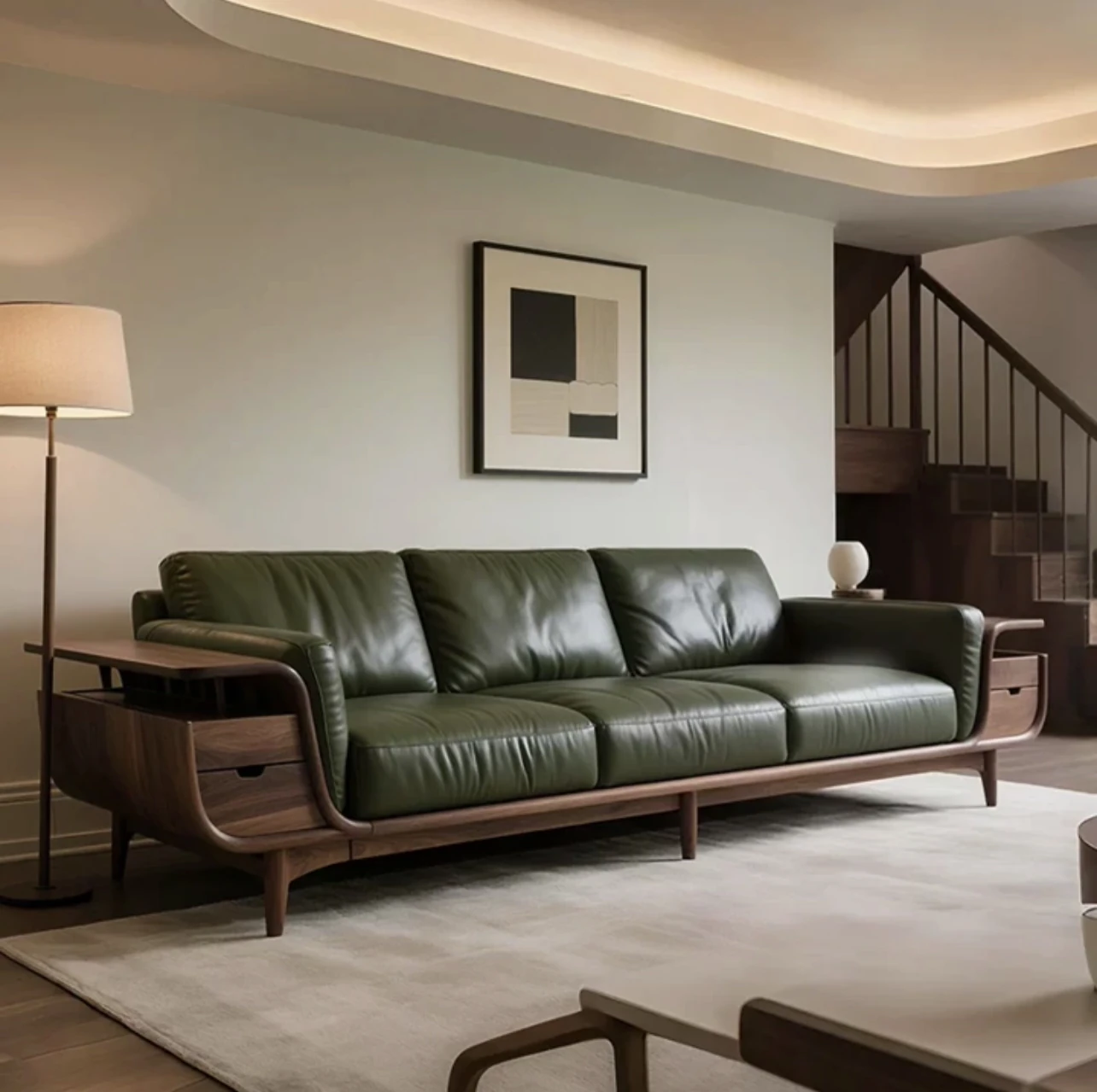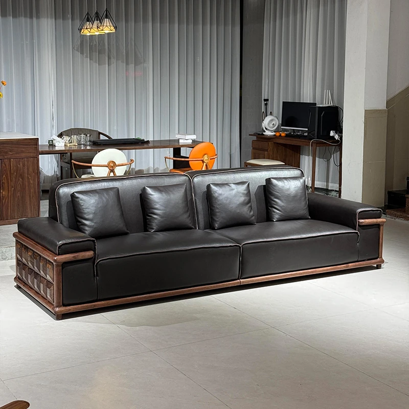 2025 New Style Solid Wood Sofa - Modern Minimalist Home Living Room Black Walnut Leather Sofa, Perfect for Stylish Comfort