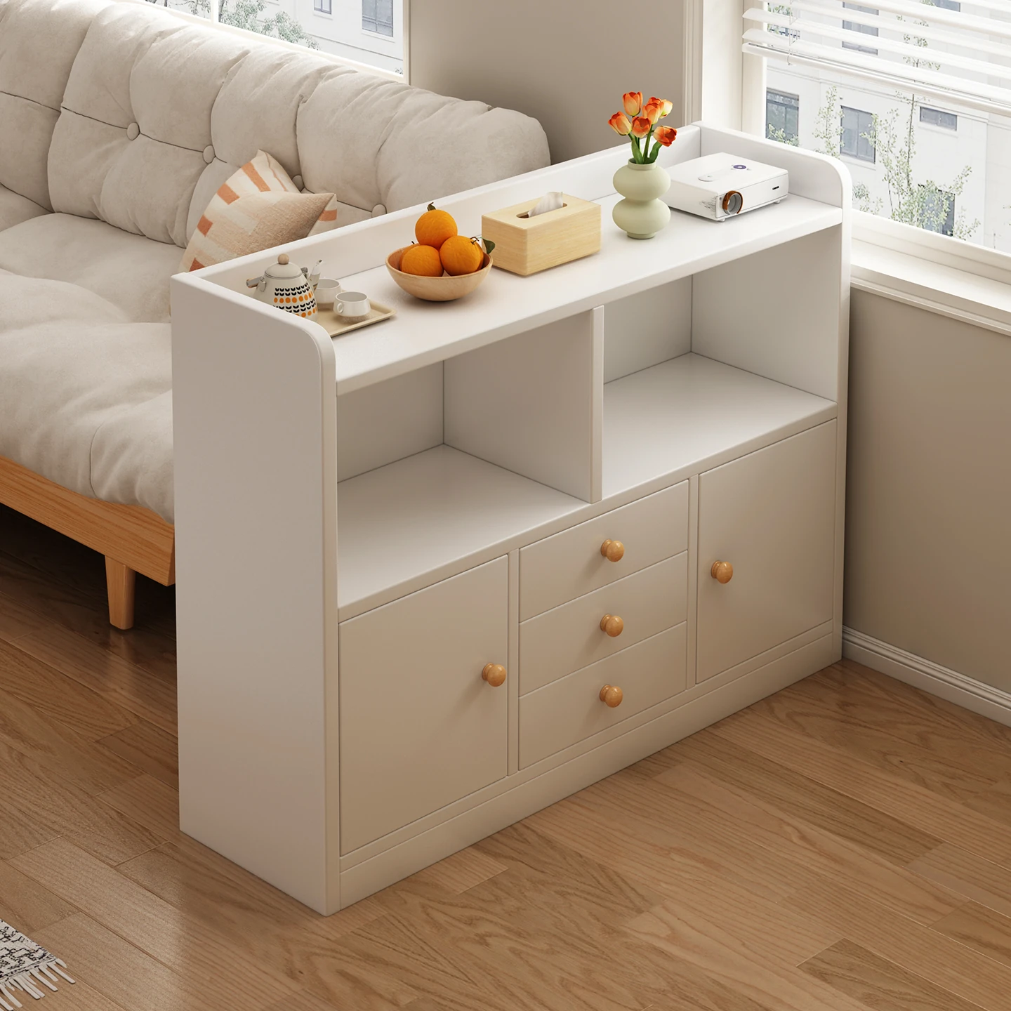 おしゃれな書棚&収納キャビネット - リビングの間仕切りにも最適!壁にぴったり設置できる収納力抜群の引き出し付き書架。寝室にもぴったりな低型ボックスキャビネットで、スッキリとした空間を演出します。
