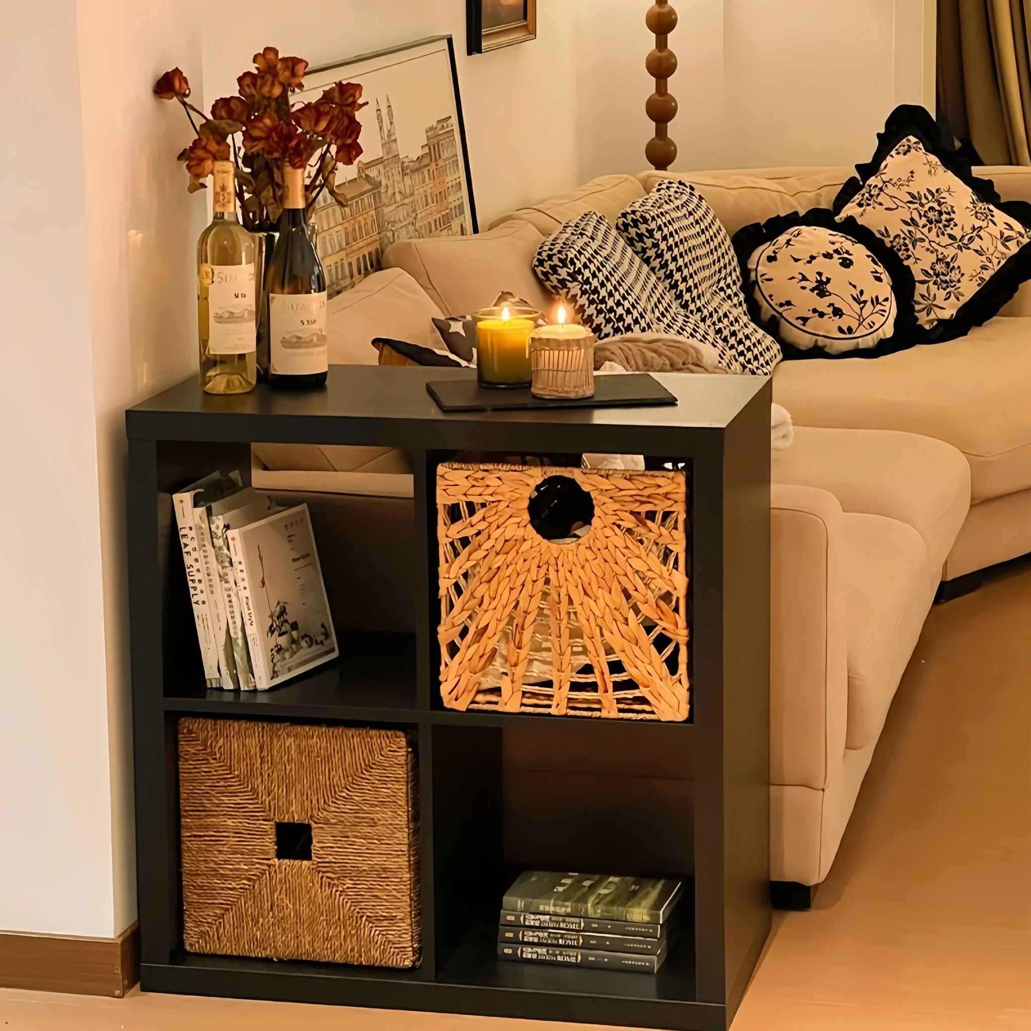 北欧風ブラック4段棚 カレック格子キャビネット ソファサイドボード 仕切り棚 収納キャビネット フロアブックシェルフ 小型キャビネット おしゃれで機能的なインテリアを実現!