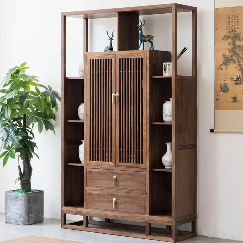 2025年新作!胡桃木製のおしゃれな多宝阁展示棚 - 新中式デザインの実木製、シンプルでスタイリッシュな茶葉・茶室用の茶饼ラック!お部屋を華やかに演出します。