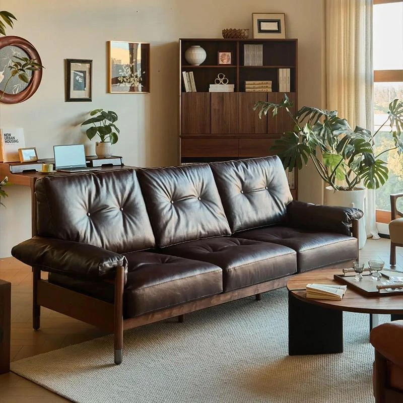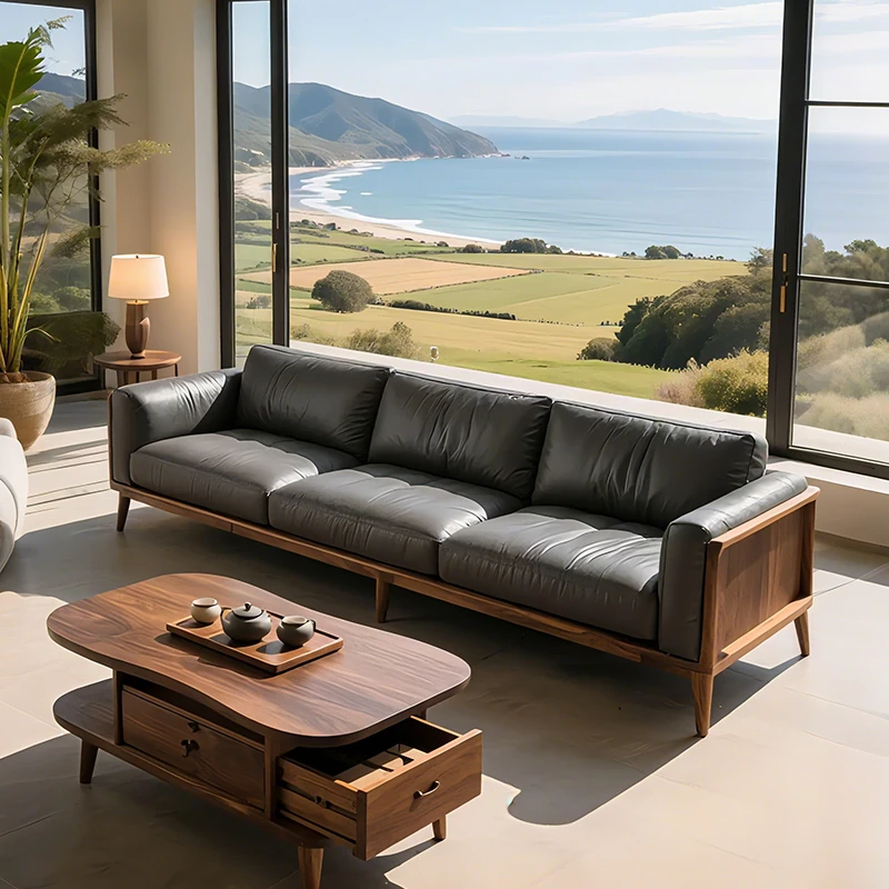 2025年新作!新中式スタイルの現代的でシンプルなリビング用ソファ。高品質なウォールナット材とエレガントなレザー仕立てで、心地よいくつろぎの空間を演出します!