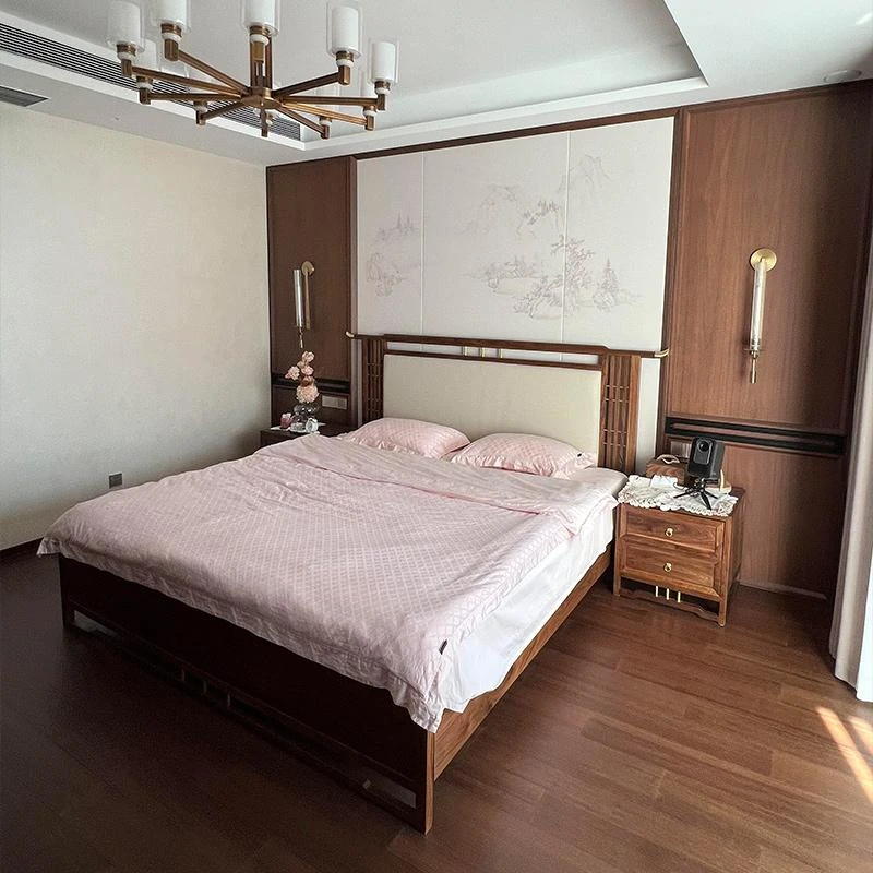 2025年新作!ウッド調の軽奢ダブルベッド、1.8m幅のウォールナット製、現代的でシンプルなデザインの主寝室用マリッジベッド。上質な寝心地を追求した、あなたの特別な空間に最適!