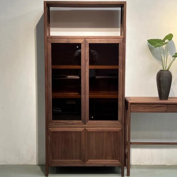 新中式スタイルの2025年新作モダンミニマリスト天然木製リビング用ガラス扉ディスプレイキャビネット ウォールナット木製ブックキャビネット - 高品質なデザインで、あなたのリビングを洗練された空間に変えます!
