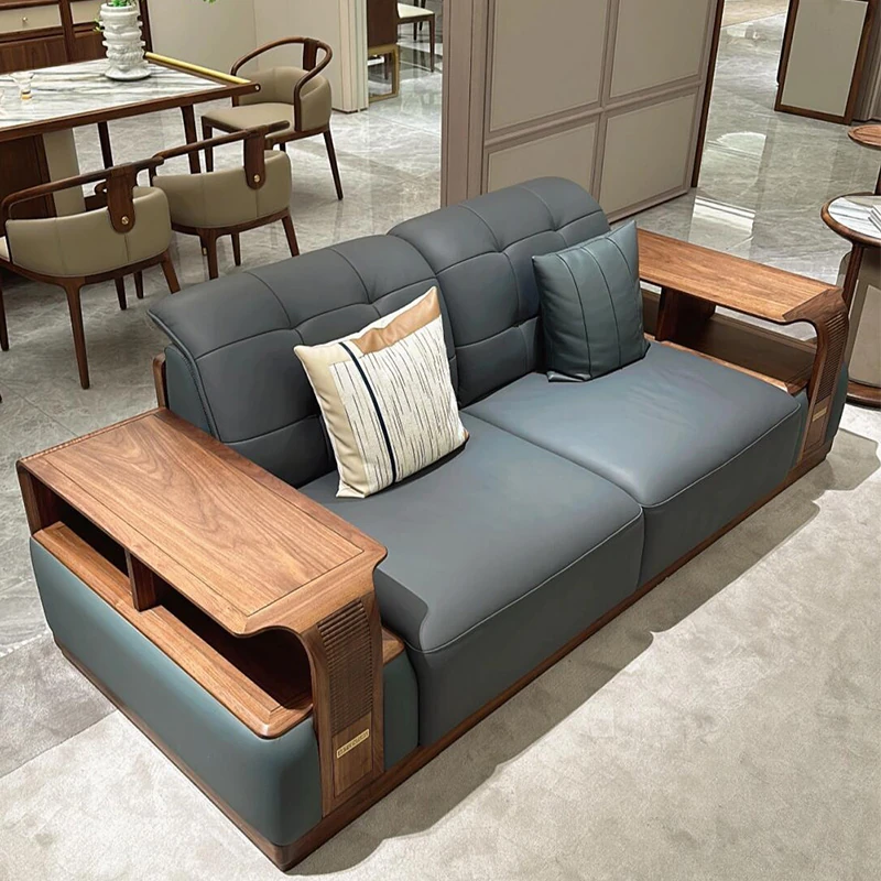 2025年新作!現代ミニマルデザインのリビング用レザーソファセット - 新中式スタイルの無垢材使用、ウォールナット仕上げで洗練された空間を演出!