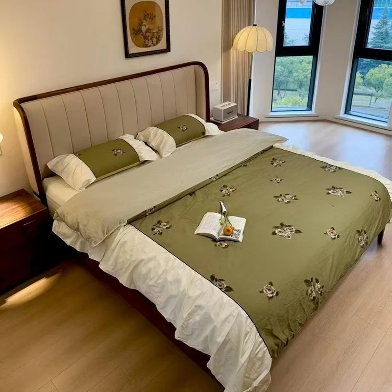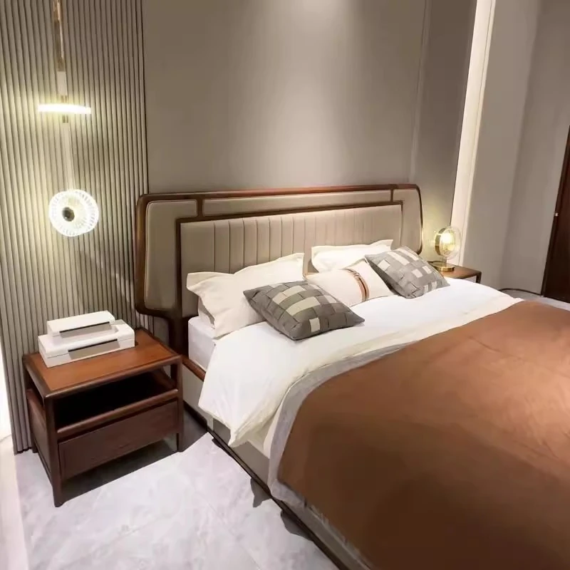 新中式スタイルの無垢材ベッド2025年新作!モダンでシンプルなデザインの1.8mダブルベッド、皮革仕上げ、主寝室に最適!快適な眠りを提供します。