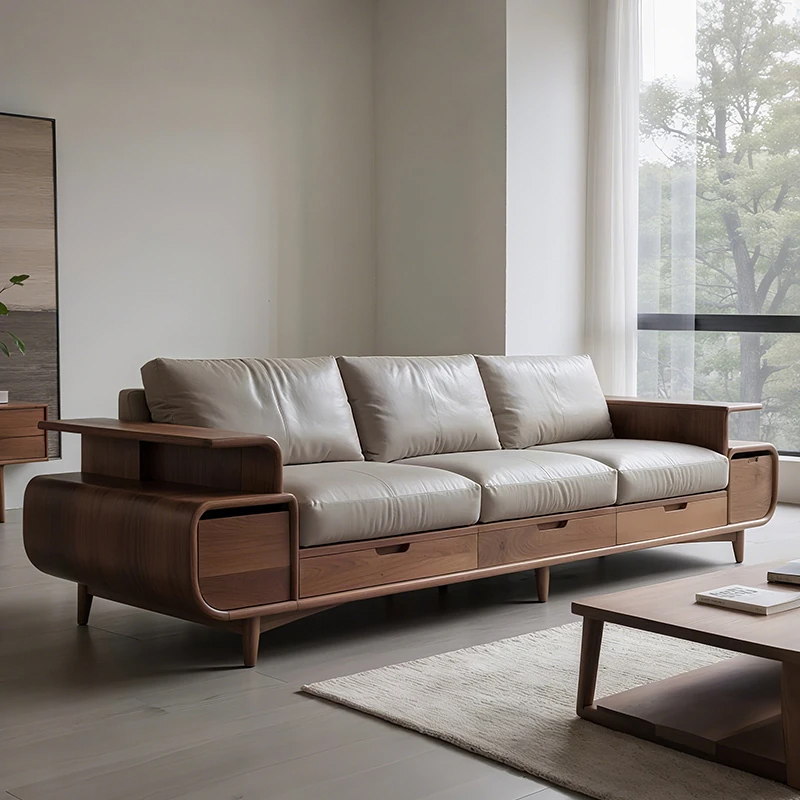 新中式デザインの直排ソファー|古風なクルミ材使用で、リビングにぴったりなシンプルかつラグジュアリーな皮革収納付き3人掛けソファ。おしゃれで機能的な空間を演出します!