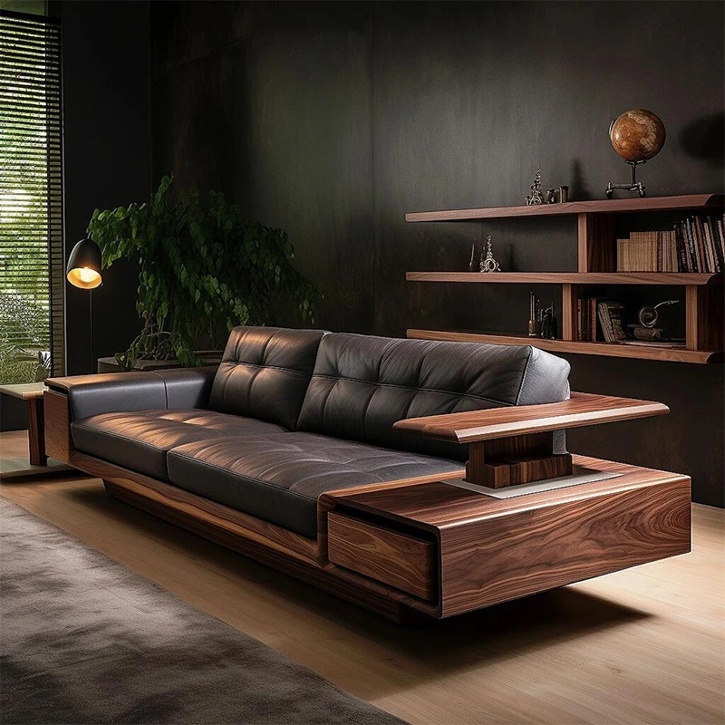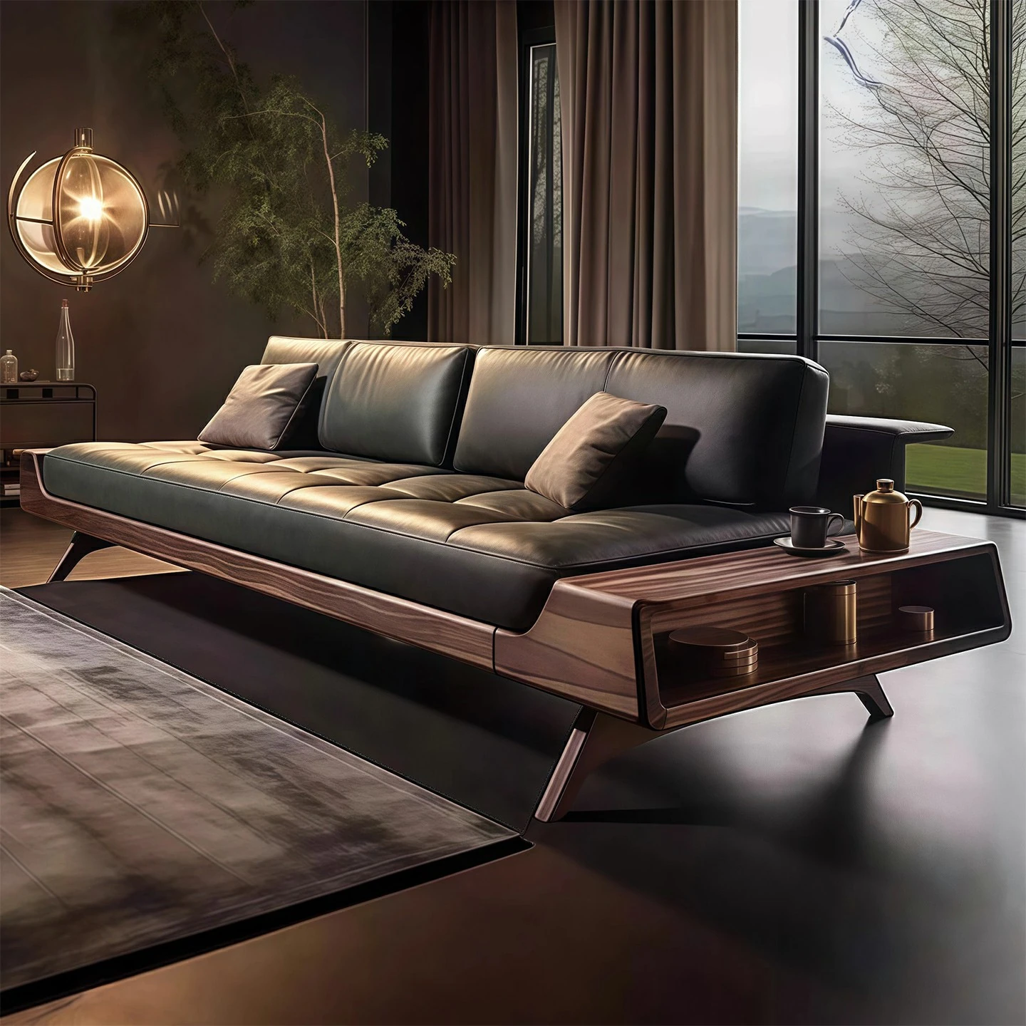 2025年新款!中古風デザインの高級感溢れるモダンソファ。リビングにぴったりな実木ナッツウッドとレザー素材使用。快適な座り心地で、居心地の良い空間を演出します!