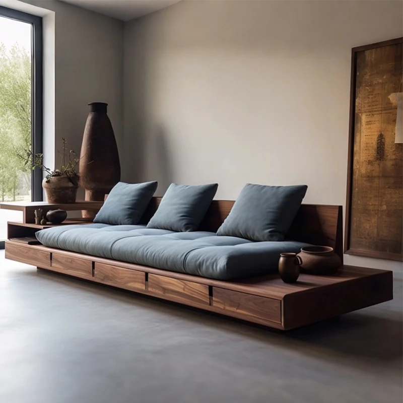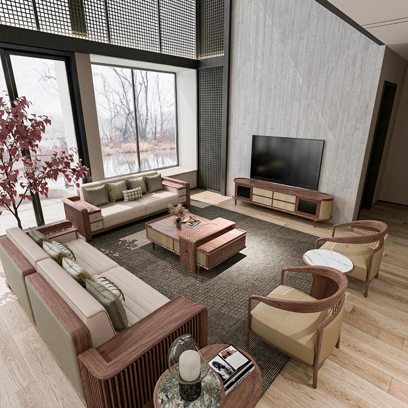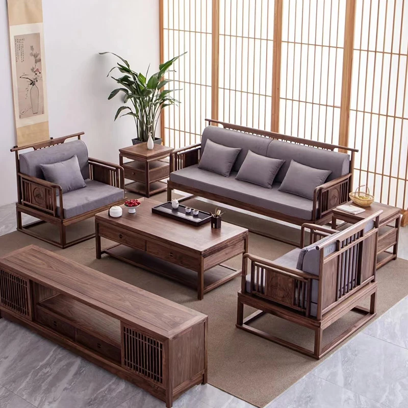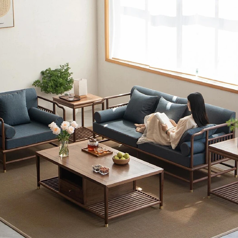 2025年新作!新中式スタイルのソファセット - モダンでシンプルな無垢材使用、胡桃木とファブリックの絶妙な組み合わせ。おしゃれで快適なリビング空間を演出します。