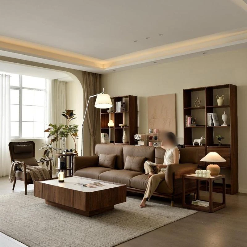 2025年新作!新中式胡桃木沙发 - 家庭用、休息区、接待室兼用的实木皮艺沙发,提升您的客厅品味与舒适度。
