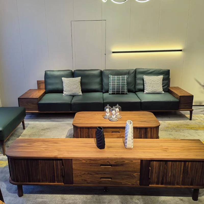 2025年新作!新中式デザインの現代的でシンプルなリビング用ソファ。ブラックウォールナット無垢材とレザーを使用した直線的なスタイルで、洗練された空間を演出します。家族や友人とのくつろぎのひとときをお楽しみください!