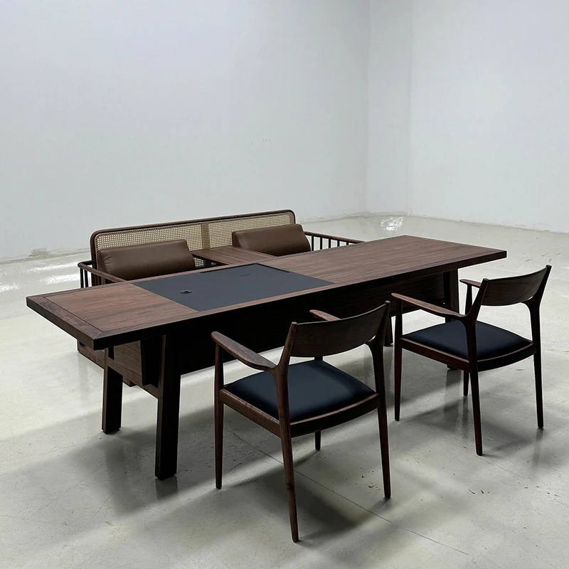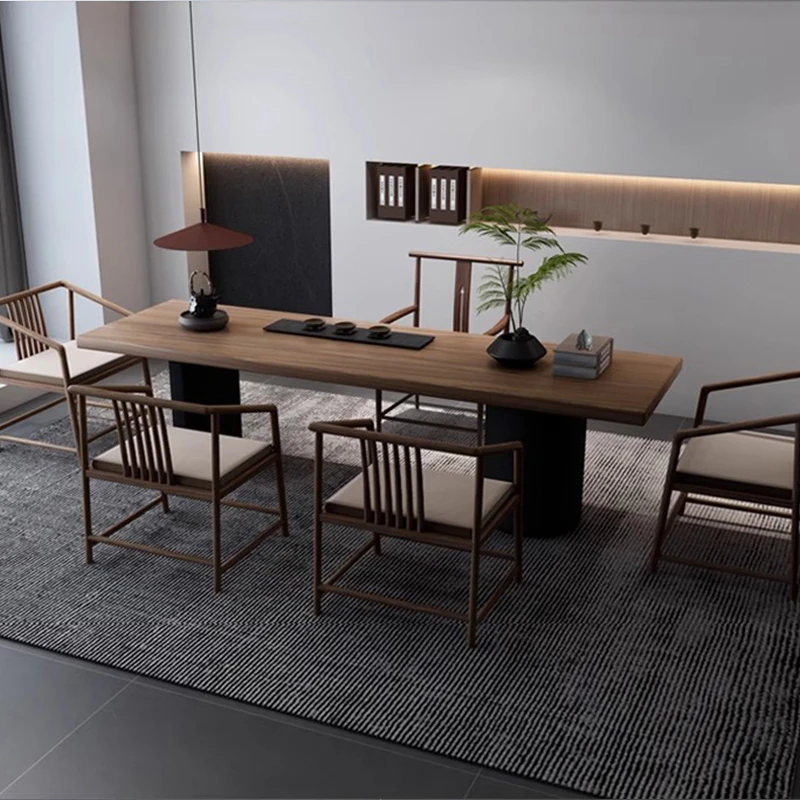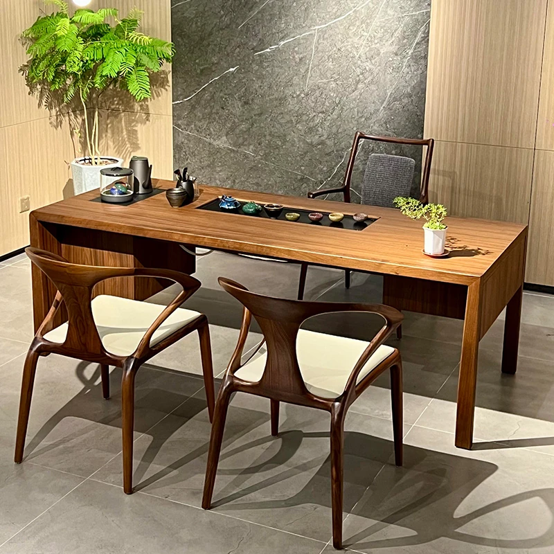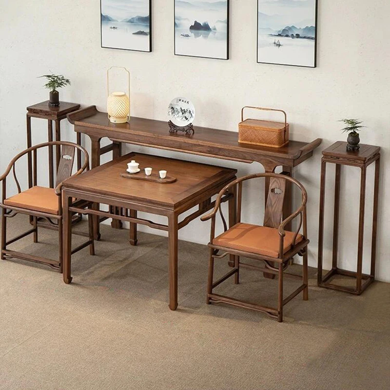 新中式ブラックウォールナット製ティーテーブル&チェアセット - シンプルで洗練されたデザイン、オフィスや民宿、家庭に最適な高級無垢材の茶卓。リラックスしたひとときを演出します。